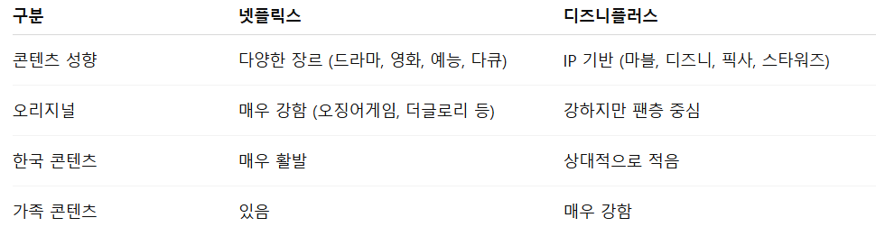 넷플릭스는 콘텐츠 소비의 폭이 넓고, 디즈니플러스는 확실한 취향 콘텐츠를 깊게 즐기는 구조입니다. 그래서 요즘은 둘 중 하나만 쓰기보다는 “번갈아 구독”하는 사람도 많아졌습니다.