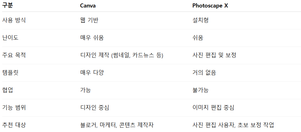 캔바와 포토스케이프는 단순히 “더 좋은 툴”을 고르는 개념이 아니라 “어떤 작업을 하느냐”에 따라 선택이 달라집니다.